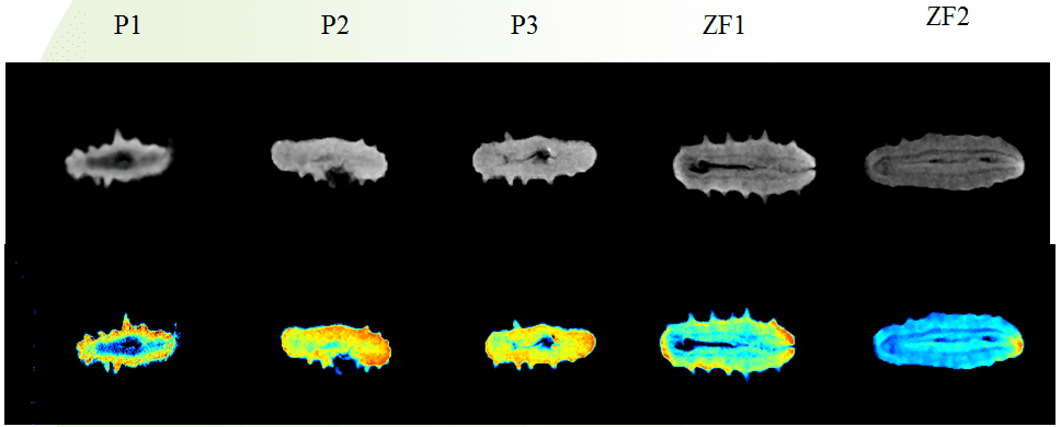 结论:在一定温度下,随着海参复水时间的延长(P1~P3,ZF1~ZF2),自由水含量不断增大,水分流动性增大。T1加权像中反映越来越暗。T1加权像中弛豫时间越短,图像越亮(伪彩图中越红)