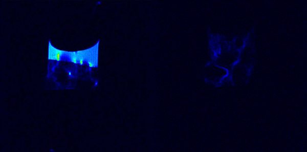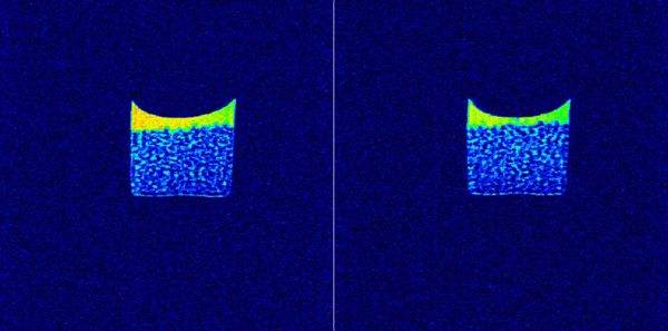 左图的图像上方较亮部分为水溶液,下方偏暗色区域为饱水的小玻璃珠。右图的图像中为非饱水样品。由图像可知在样品内部水分分布并不均匀。大玻璃珠成像
