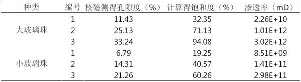 饱和度计算是在孔隙度的基础之上的,所以其准确度与孔隙度的准确度密切相关。渗透率随着水量增加而增加,且在同级别饱和度下,大玻璃珠内渗透率大于小玻璃珠。核磁共振成像小玻璃珠成像