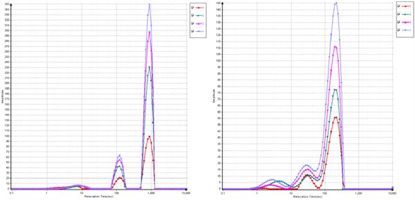 左:大玻璃珠孔隙分布,饱和度分别为1:32.35%;2:71.13%,3:94.08%;4:100%。右:小玻璃珠孔隙分布,饱和度分别为1:19.25%;2:40.57%,3:60.26%;4:100%。图中横坐标为T2,纵坐标为信号强度。对于同一幅T2分布图,各个峰面积比总面积代表对应孔隙所占比例。