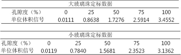 孔隙度测定由于大小两类玻璃珠形成的孔隙大小不同,饱水后(孔隙完全被水充满)孔隙内水的弛豫时间差别较大,定标时分别用纯水做大玻璃珠定标线,用饱水后的小玻璃珠做小玻璃珠的定标线。定标数据如下: