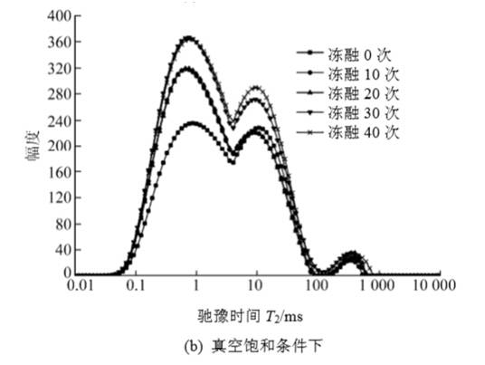 经过40 次冻融循环后,花岗岩的T2 谱分布主要表现为3 个峰图,随着冻融次数的增加,T2谱形态上发生了左移,即向小孔隙的T2 谱方向偏移。这也说明了在冰的冻胀和融缩作用下,岩石内部产生了新的微孔隙。