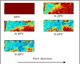 红色代表油的信号,绿色代表水的信号。0PV代表饱和油,然后进行水驱,从左至右,中间部分首先被驱替,端面仍残留一些油。通过成像观察,可以看到优势通道和端面效应。