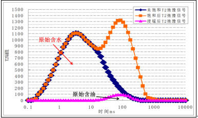 在原始状态下,测试地层取心岩样的T2弛豫谱,相应的峰面积对应的是原始含油含水饱和度。将岩心浸入锰离子溶液,抑制水的信号,此时进行T2谱测试得到原始含油饱和度,原始含油含水饱和度减去原始含油饱和度即获得原始含水饱和度。