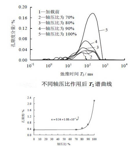 随着轴压的增大,孔隙度总体呈指数增长趋势。当轴压比处于0~70%段时,曲线斜率很小,岩石内部裂隙发育缓慢,损伤增量较小;当轴压比处于70%~90%段时,曲线斜率明显增大,孔隙度增量较大且增速越来越快,表明大理岩内部裂隙数量增多,裂纹开度增大,损伤程度加剧,大理岩逐渐由弹性变形向塑性变形转化;当轴压比处于90%~100%段时,曲线的斜率急剧增大,孔隙度成倍增加,岩石内部孔隙加速扩展和贯通,损伤急剧增加直至破坏。
