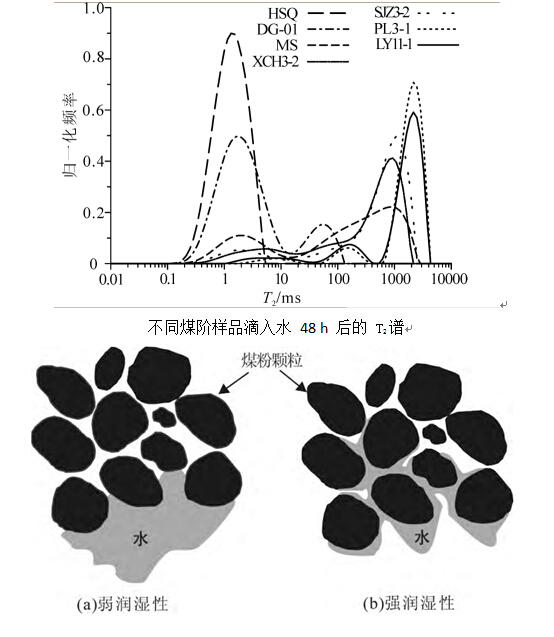 水滴入强水湿煤粉中测得T2弛豫谱仅存在吸附态水峰与颗粒间水峰,弱水湿煤粉则存在自由态水峰、颗粒间水峰和吸附态水峰。煤粉越水湿,水在煤粉颗粒间扩散越明显,在颗粒间形成的水膜面积越大,使得颗粒间水峰和自由态水峰弛豫时间越短,随时间变化向左移动规律越明显。