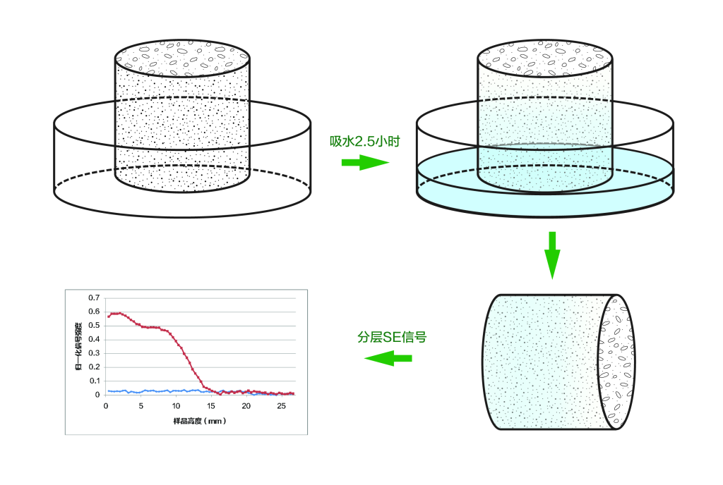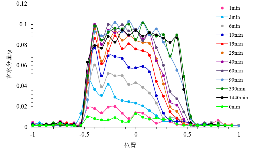 对于动态样品,需要快速测大孔孔隙里面的分层含水率和水分分布状态,可以通过空间编码技术实现,测得不同位置的含水率变化,通过观察样品吸水过程中的水分迁移,实现水分迁移动态研究,分析其渗透吸水性能。