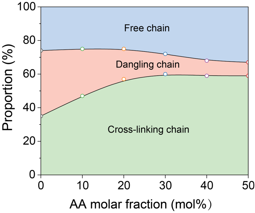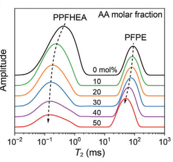 该课题组进一步通过低场19F核磁设备测量了氟化物组分在氟凝胶中的迁移分布情况(图2),他们此次使用的是开云官方站登录入口生产的型号为VTMR20-010V-I设备,该仪器可以配置F探头来检测F信号。一般来说,T2值越大,对应物种的流动性越高。在该体系中,较短弛豫时间的T2峰源于PPFHEA的氟化侧链,而较长弛豫时间的的T2峰则归因于PFPE。随着AA含量的增加,两个T2峰都向较低的弛豫时间移动,这表明PPFHEA/PFPE润滑相内聚合物链的流动性逐渐受到限制。此外,他们对核磁信号进行反演后,拟合出体系内自由链、悬挂链和交联链的比例(图3)。在纯PPFHEA中,悬挂链的比例为39%,而在氟凝胶中,该比例显著降低。当AA含量增至50 mol%时,交联链的比例则呈相反的趋势。这些发现清楚地表明,随着AA含量的增加,通过形成额外的氢键,交联密度显著提高。
