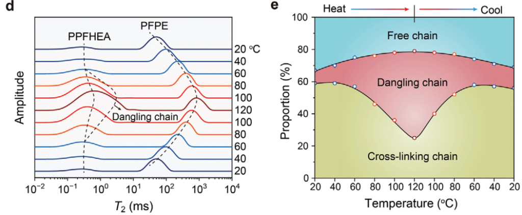 得益于低场核磁VTMR20-010V-I设备的变温功能(能实现-100℃-250℃的变温能力),他们又对变温状态下的氟凝胶中PPFHEA和PFPE组分的流动性变化进行了测试(图4),随着温度升高,PFPE的流动性增强,而PPFHEA的信号在80°C以上分裂成两个峰。PPFHEA出现的较高肩峰被归因于PAA片段之间氢键解离释放出的悬挂链。值得注意的是,在冷却过程中,峰型的变化完全可逆,这表明氟凝胶具有极佳的结构可逆性。为了进一步量化这些变化,在不同温度下计算了自由链、悬挂链和交联链的比例。随着温度升高,仅轻微减少了自由链,悬挂链的数量却出现了显著增加,而交联链的数量则减少了。冷却过程中,所有链段的比例逐渐恢复至初始状态。这些发现清楚地表明,氟凝胶在高温下的高附着力与悬挂链的存在有关,而在室温下的高润滑性则归因于高比例的悬挂链、交联链。