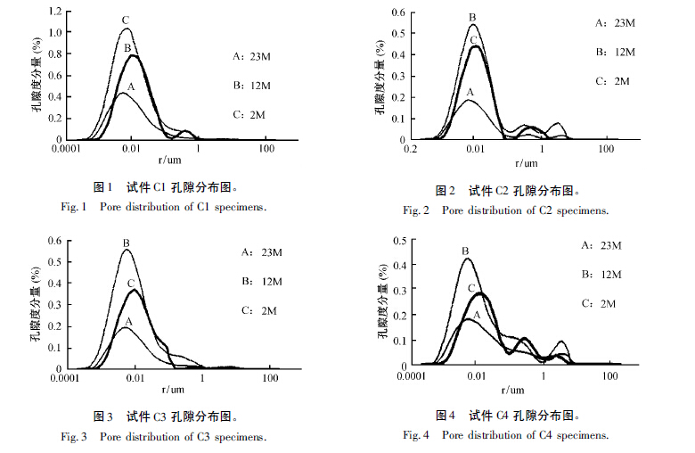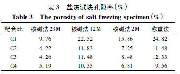 采用核磁共振方法,使用不同磁场强度分别测试了盐冻试件( C1、C2、C3、C4 组配合比) 的孔隙率与孔隙分布情况。为对照测试结果,还采用了称重法测孔隙率。