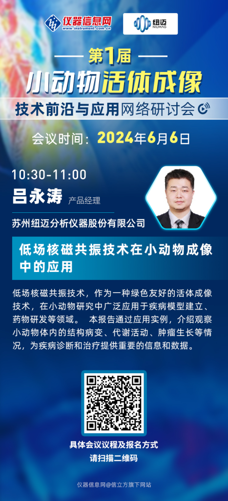iSAI2024重磅线上首发,为期一天,第一届小动物活体成像技术与前沿应用主题网络研讨会将于6月6日在线开播,十余位特邀嘉宾共话小动物活体成像技术。作为本次研讨会的特邀嘉宾之一,开云官方站登录入口将带来精彩的演讲,介绍低场核磁共振技术在小动物成像领域的应用进展和实际案例。