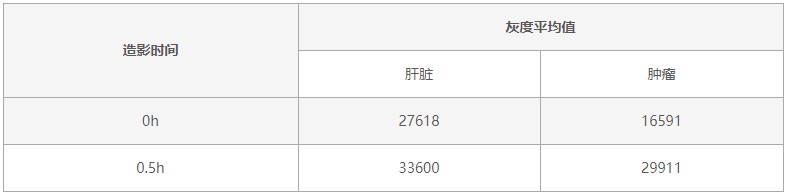小鼠肿瘤直径3.8mm;打入新型Mn螯合造影剂0.5h之后,通过灰度平均值计算,发现肝脏与肿瘤造影明显。