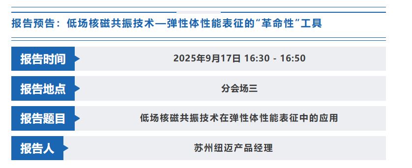 2025年9月17日下午16:30-16:50,分会场三,苏州开云官方站登录入口期待与您相遇,共同探讨低场核磁共振技术的无限可能,携手推动弹性体材料迈向更高性能、更绿色智能的未来!