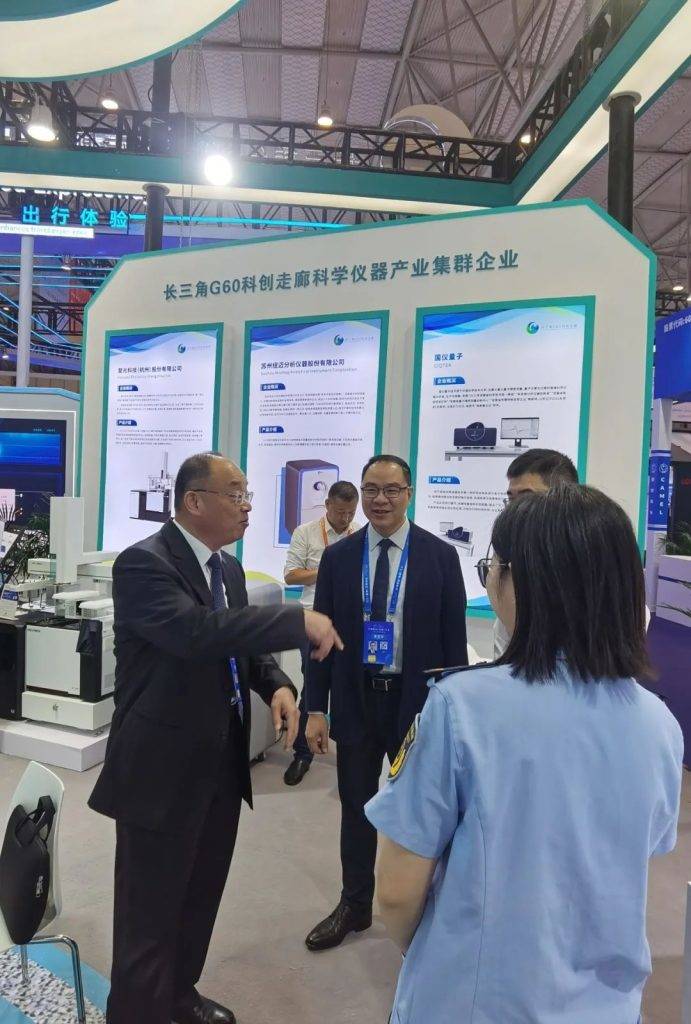 现场,长三角G60科创走廊科学仪器展区吸引了来自江苏省、浙江省、四川省等省市级质检系统等多个单位领导莅临展位参观交流。