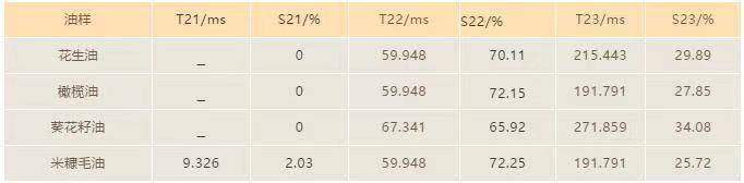 2、研究还发现,其它不合格油脂如其它种类毛油、煎炸油、酸败油的弛豫图谱均能在10ms左右出现特征小峰T21,因此本实验方法可以进一步应用到其它油脂掺假研究中,作为食用油掺假的初步判定。