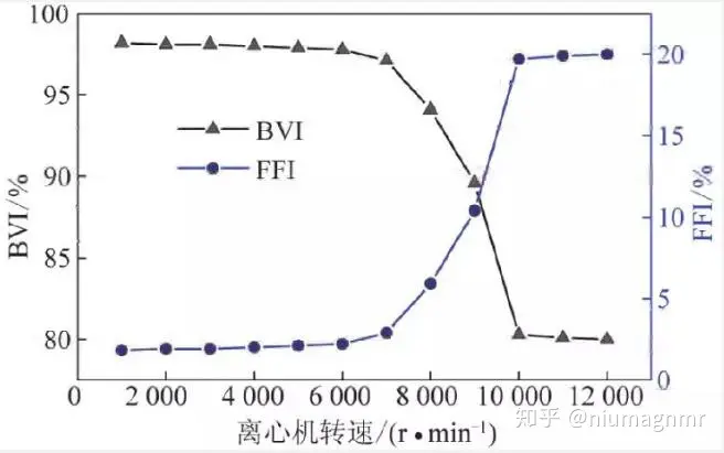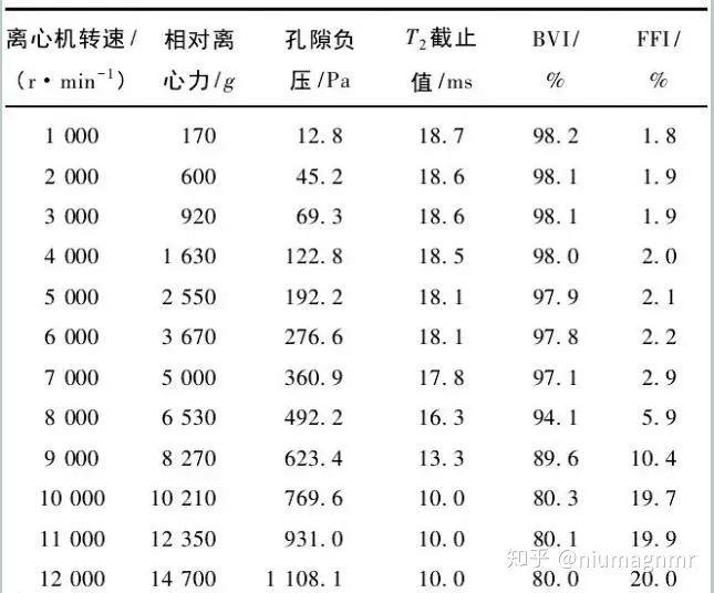 3.将步骤2中核磁共振测试后的12份饱和水煤样,利用高速离心机分别在转速为1000一12000r/min条件下离心30 min。进行第2次核磁共振测试,反演T2分布,同时核磁共振岩心分析软件计算得出T2截止值,BVI,FFI参数,研究孔隙负压对煤层水锁效应解除方法。