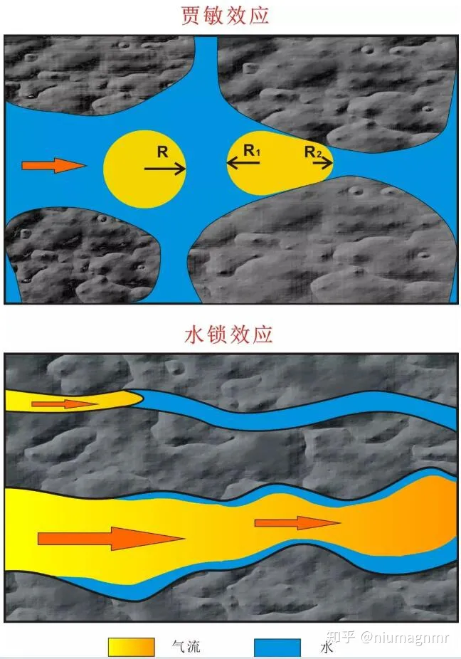 水锁效应来源于油气开发过程中,当钻井液、完井液侵入石油储集层后,造成近井壁处油气相渗透率降低的现象。非常规致密储层的开发,极大的依赖水力压裂技术,而实践表明,压裂液的反排率通常很低。大量的压裂液滞留在地层中引起了水锁效应与贾敏效应(如图1),造成了储层伤害,这对非常规油气的开发是极为不利的。