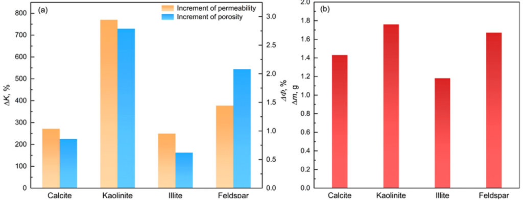 图一 CO2、水和岩石相互作用孔隙度/渗透率增量(a)和质量损失(b)