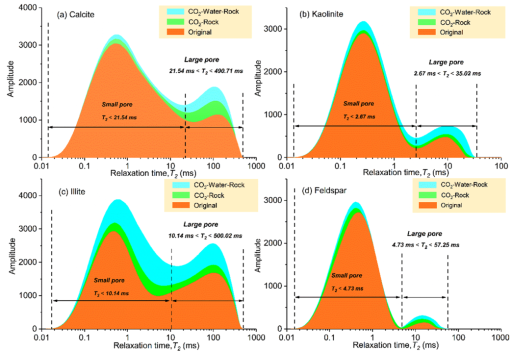2)图二核磁共振试验证明,由于溶解反应的存在,导致CO2−water−rock的振幅增加比CO2−rock试验大,且振幅的改变幅度与不同类型的矿物和孔隙相关。