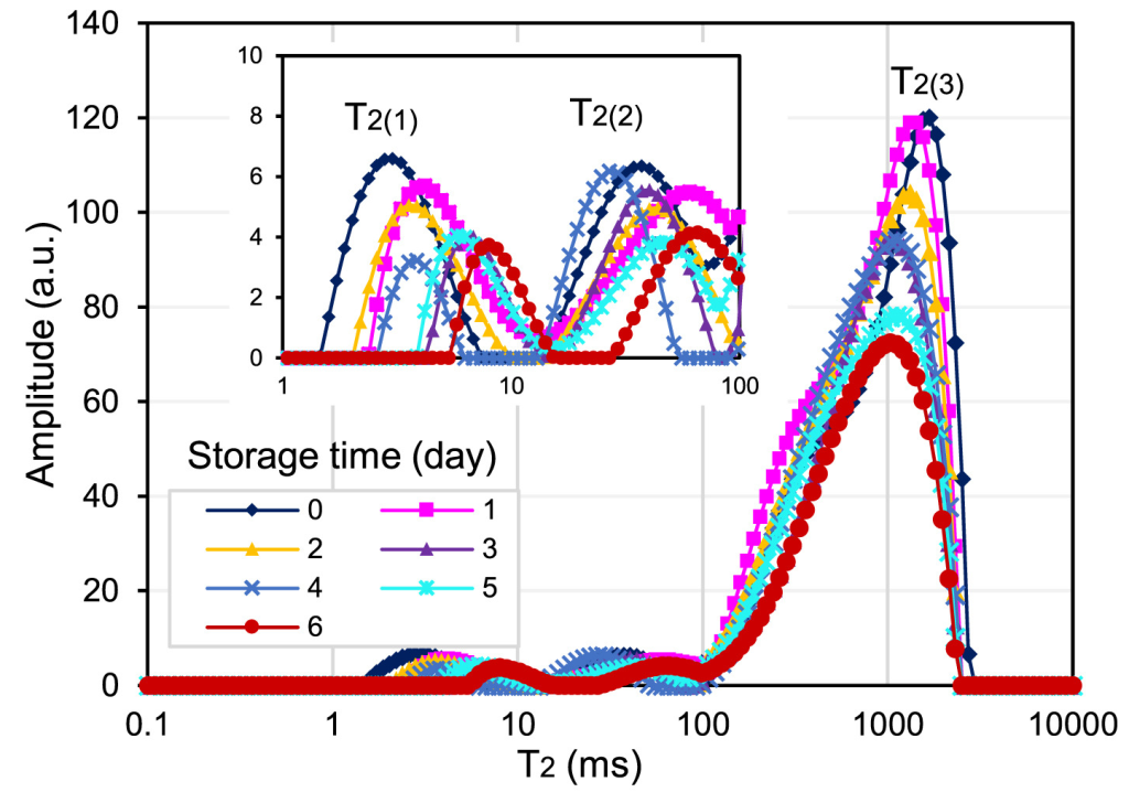 糖化工艺主要为纤维素糖化过程,需要对生物质原料进行预处理和加酶水解。低场核磁技术通过对生物质原料水解前后进行T2分析,得知不同水分状态水分子的结合模式(短T2的组成水、中T2的固定化水和滞化水,长T2的自由水)[2],可用来评价水解的效果。这样就可以对生物质原料的选择(如草本植物、软木和硬木)、预处理方法(汽爆法、酸法等),以及各商品酶进行多维评价,可用来优选工艺 [3]。