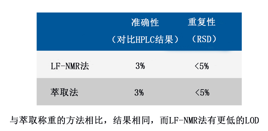 在某些预处理技术中,生物质中的脂质可能会释放到发酵液中。测量油含量有助于评估脂质回收的效率和确定后续的脂质提取步骤[5]。事实上,发酵过程中需要对发酵液不断监控,传统方法使用萃取技术,但需要使用有机溶剂且费时费力;色谱法则需要对样品进行复杂前处理;近红外法的灵敏度尚难以达到定量要求。采用低场核磁法则可以弥补上述方法的不足 [6]。