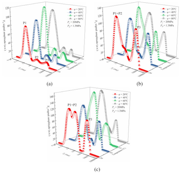 最初,不同温度下砂岩弛豫分布呈三峰分布(图三(a))。然后,随着注浆的继续,T2分布逐渐变化(图三(b)和(c))。随着注入时间从t=30s增加到60s,第二峰几乎与第一峰合并,T2弛豫分布从三峰分布转换为双峰分布(图三(b)),其中新的第一峰(P1+P2)和第二峰(P3)分别分布在0.1ms–100ms和100ms–1000ms的范围内。此外,随着注入时间的增加,不同温度下新的第一峰(P1+P2)和第二峰(P3)均增大,意味着浆体同时渗透到微孔、大孔和裂缝中。此外,随着温度从20℃升高到80 ℃,t= 30s处新的第二峰(P3)面积减小,这代表了温度升高对裂缝中浆体的流动有明显阻碍作用。如图三(c)所示,随着进样时间从t=30s增加到60s,新的第二峰(P3)变化不大,而新的第一峰(P1+P2)的面积和峰值明显增加。这意味着此时的渗流过程主要发生在岩石孔隙中,浆体从裂缝渗透到微孔隙中。