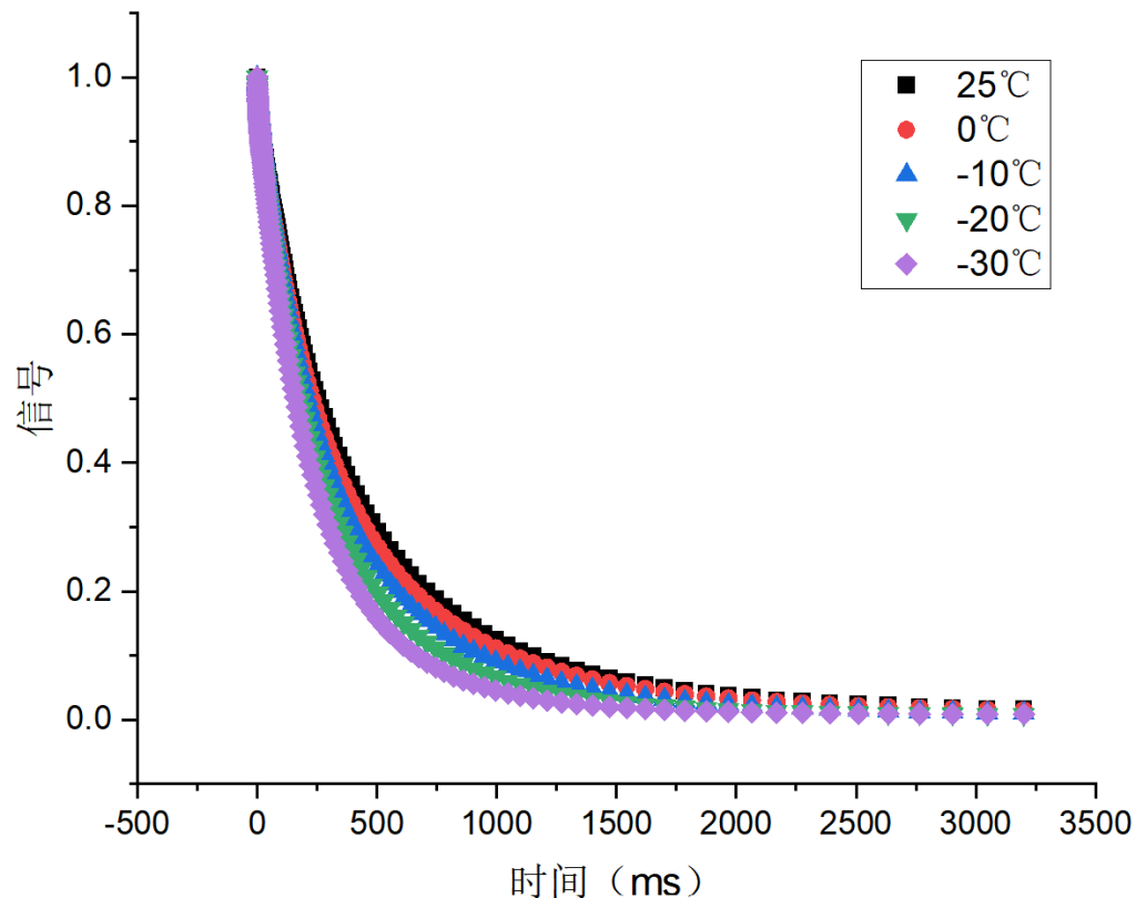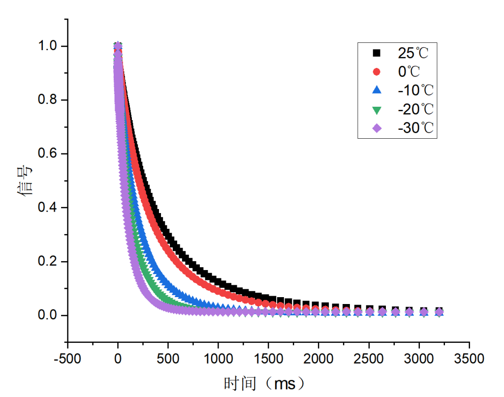 三种样品的弛豫行为类似,随着温度的降低,水凝胶中自由水的活动会越来越弱,导致弛豫越来越快,从三张图中可以看出,样品c的弛豫变化相较于a、b不明显,说明随着盐含量的增加,样品c中自由水受到温度变化产生的影响较样品a、b明显变少,也证明了样品c的抗冻性能力较a、b更强。