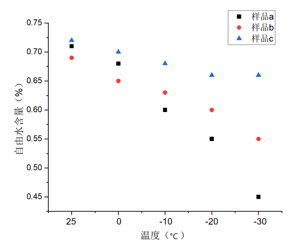 自由水的比例变化决定了水凝胶的抗冻性能,不同温度下自由水比例变化越小,水凝胶越抗冻。从图表中可以看出,随着温度的降低,样品c中的自由水含量变化是最小的,也证明了样品c的抗冻能力较a、b来说更强。