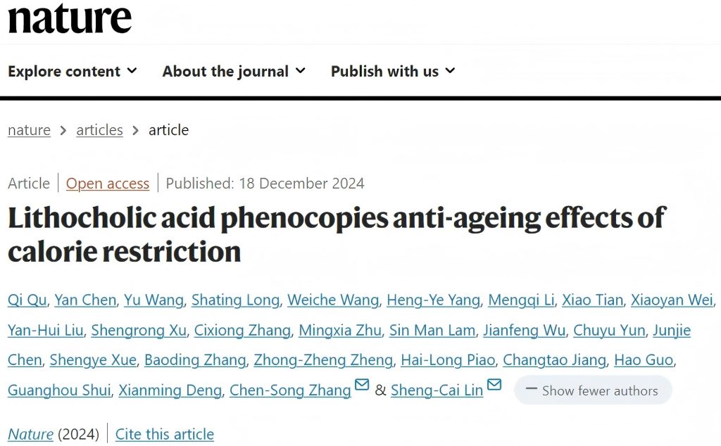 2024年12月18日,厦门大学林圣彩院士团队在国际顶级期刊《Nature》发表题为“Lithocholic acid phenocopies anti-ageing effects of calorie restriction”的研究论文,该研究发现石胆酸表型模仿卡路里限制的抗衰老作用。研究人员使用代谢组学来分析在CR期间丰度发生变化的代谢物,并进行后续的功能验证。研究发现,石胆酸(LCA)是一种代谢产物,单独使用可以重现CR在小鼠中的作用。这些作用包括激活AMP-活化蛋白激酶(AMPK)、增强肌肉再生以及恢复握力和跑步能力。LCA还激活AMPK,并诱导秀丽隐杆线虫和黑腹果蝇的寿命延长和健康延长效应。作为C.elegans和D.黑腹果蝇不能合成LCA,这些结果表明,一旦施用,这些动物就能够传递LCA的信号传导效应。在所有三种动物模型中,AMPK的敲除消除了LCA诱导的表型。总之,该研究确定了单独施用CR介导的上调代谢物LCA可以AMPK依赖性方式赋予后生动物抗衰老益处。