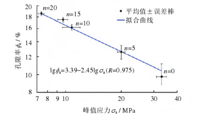 图9为随着循环次数的增加,峰值应力与孔隙率的关系曲线,从图中可以看出,随着孔隙率的增大与峰值应力呈现出正相关关系。