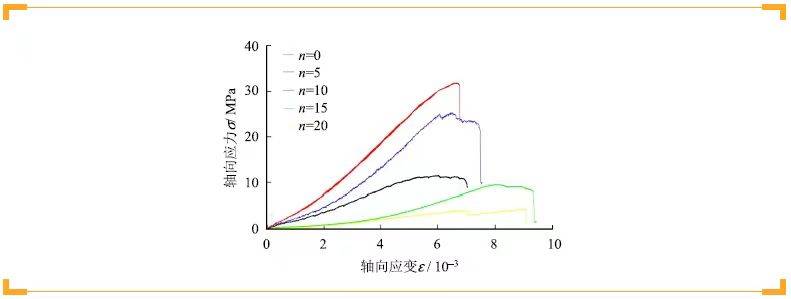 图7为经过不同次数的干湿循环后,得到的干湿循环应力-应变曲线。从图中可以看出,随着循环次数的增加,峰前加载阶段变化规律相似,峰后力学特性存在显著差异。当循环次数较少时,试样弹性阶段较长,弹性模量较大,塑性区较短,岩样呈脆性破坏;随着干湿循环次数的增加,弹性模量逐渐变小,岩石由脆性向延性发展,达到峰值应力后还有较强的承载能力,循环次数越多,延性特征越明显。