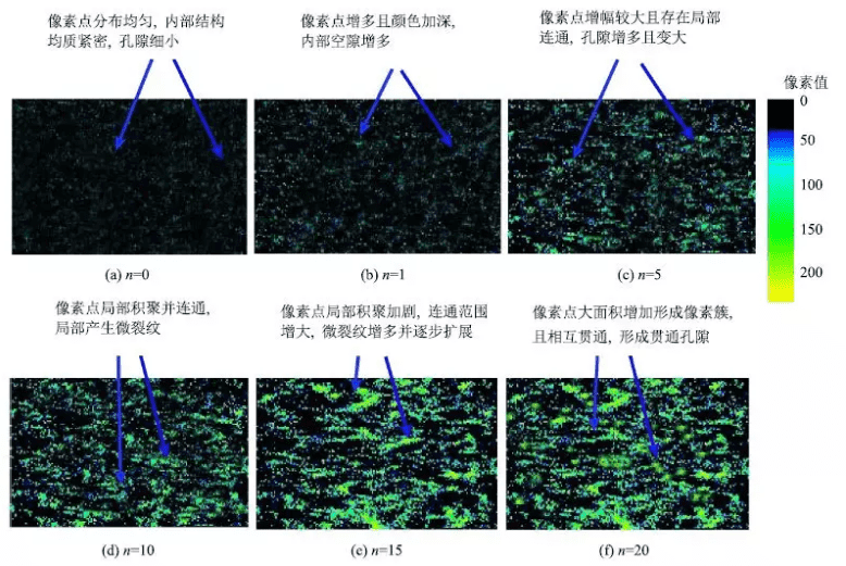 众所周知,在质子加权成像中,像素点越亮表明氢原子核含量越多,即含水率越大。图4为同一块岩样在不同循环状态下的相同截面积的MRI图,图中亮色区域代表流体填充孔隙,不同亮度代表不同的含水率孔隙,灰度值越大,孔隙,裂缝中含水率越多。当然区域中像素点越密集,代表孔隙、裂缝越发育。