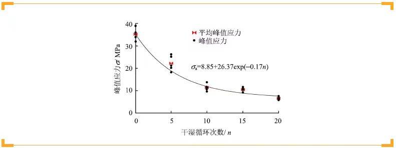 由于干湿循环次数对于泥质砂岩试样是一个累积损伤的过程, 可以作出峰值应力与循环次数(图8)。从图中可以看出,每组样品的平均峰值应力随着循环次数的增加呈指数关系降低。
