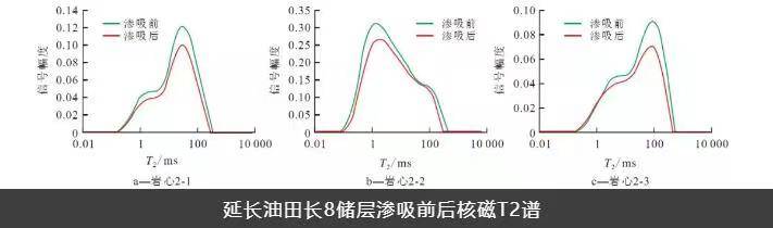 由渗吸前后核磁共振T2谱可以看出,在岩心样品处于原始含油饱和度状态时,含油孔隙半径分布表现为2个峰,左峰表示小孔隙部分,右峰表示大孔隙部分。自发渗吸实验后,左、右峰幅度比原始含油饱和度条件下测得的幅度均有减小,表明致密油储层的孔隙半径很小,而毛管压力作用很大,具有较强的毛管渗吸作用,即岩心样品小孔隙中的原油因毛管压力作用吸入水而排出油,因此利用毛管压力的渗吸作用,吸入水、排出油,对提高致密油储层的采收率具有重要意义。