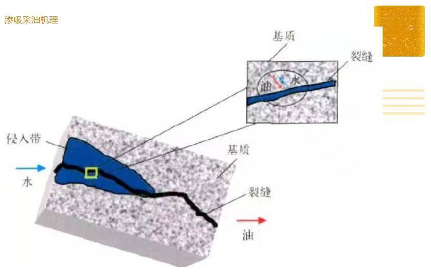 渗吸作用是开采基质孔隙原油的有效方法,但渗吸作用的动力问题一直没有得到很好的解决。一般认为渗吸的动力是毛管力作用下的润湿性流体自发的吸入孔隙中驱替非润湿流体的过程。根据渗吸方向,可分为同向渗吸和逆向渗吸;根据流体饱和顺序,可分为油驱水过程和水驱油过程,如下图。