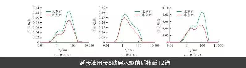由研究区长8储层岩心样品驱替前后核磁共振T2谱可以看出,在水驱油实验过程中,油量的减少使得油相弛豫信号逐渐减弱,T2谱左、右峰幅度均减小,但右峰幅度减小更明显,表明注入水主要驱替的是一些大孔隙和中孔隙中的原油。同时残余油弛豫时间小于100 ms,且峰值较高,说明水驱油实验过程中主要驱替大孔隙中的原油,而残余油主要存在于中一小孔隙,大孔隙中分布较少。