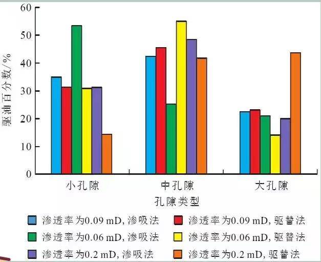 定义不同类型孔隙出油量与总出油量的比值为驱油百分数。根据弛豫时间与孔隙半径的关系,可以将水驱油前后和渗吸前后核磁共振T,谱转换为孔隙半径,进而计算出驱油百分数,见下图。