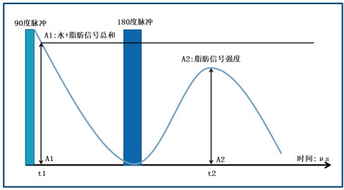 下图是低场核磁法自旋回波序列与检测到的核磁信号。在90度射频脉冲后t1处测量了自由感应衰减(FID)NMR信号。此时信号幅度(A1)是样品中水分和脂肪的信号总和。180度脉冲后,检测自旋回波信号幅度为A2,此时水的信号已经衰减为0,A2仅为脂肪的信号,根据信号强度与脂肪含量的对应关系即可对脂肪含量进行定量测试。
