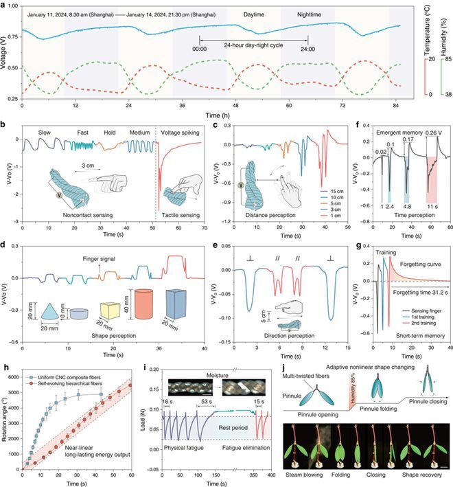 图5. 纤维的多模态功能展示:昼夜节律、感知、记忆与自适应变形