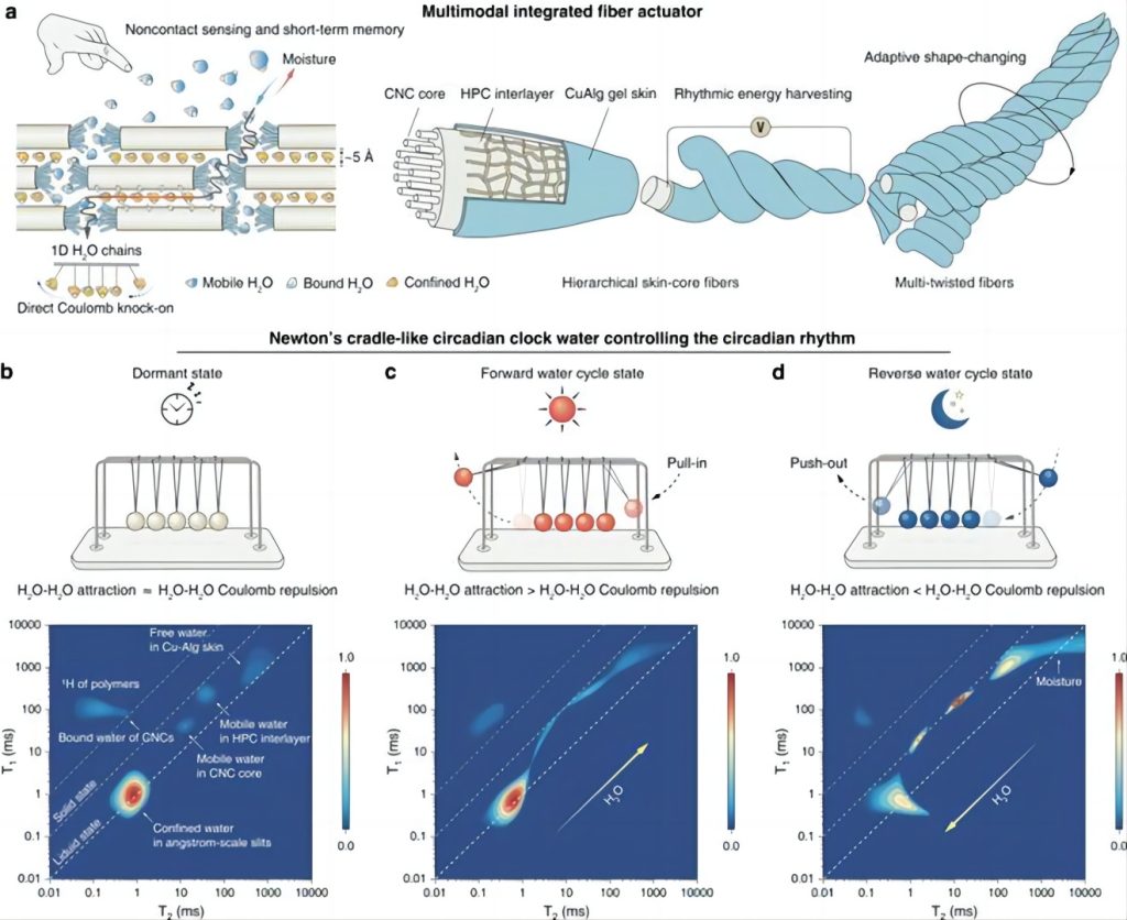 在由CNCs形成的埃尺度限域狭缝中,水通过直接库仑撞击进行传输,类似于牛顿摆运动。与无序水扩散相比,这种集体运动模式对纤维内水的变化表现出更高的敏感性。这种类似于牛顿摆的集体水运动结合界面融合实现了跨层高效水传输,在纤维内形成了一个高度敏感的负反馈回路。其中,CNCs芯层内限域水活度极低,但移动性为T1/T2 = 1.02,接近理想值(T1/T2= 1)。近乎理想的限域水就像一个主时钟一样控制着加捻纤维的昼夜节律行为。当环境中含水量与限域水相匹配时,两者停止交换,此时纤维进入休眠状态。当环境含水量低于限域水时,纤维呈正向循环状态,限域水开始向周围环境输送。当环境含水量超过限域水时,纤维进入反向水循环状态,环境中的水被输送到纤维中。限域水的自旋布居形状证实了这三种不同的交换模式。