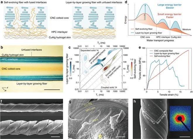 图2. 水凝胶纤维的自进化过程与分层结构表征