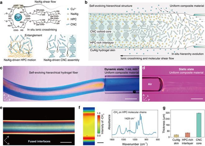 研究者通过偏振光学显微镜直观展示了多材料水凝胶纤维中界面融合层级结构的原位分层演化过程。通过同步辐射傅里叶变换红外显微光谱(SR-FTIR)表征水凝胶纤维中甲基基团(1429 cm−1)的分布,精确测量了分层结构的厚度。其中,CNCs胶体芯层为功能层,羟丙基纤维素(HPC)富集的中间层为力学强层,海藻酸铜(CuAlg)水凝胶皮层为保护层。