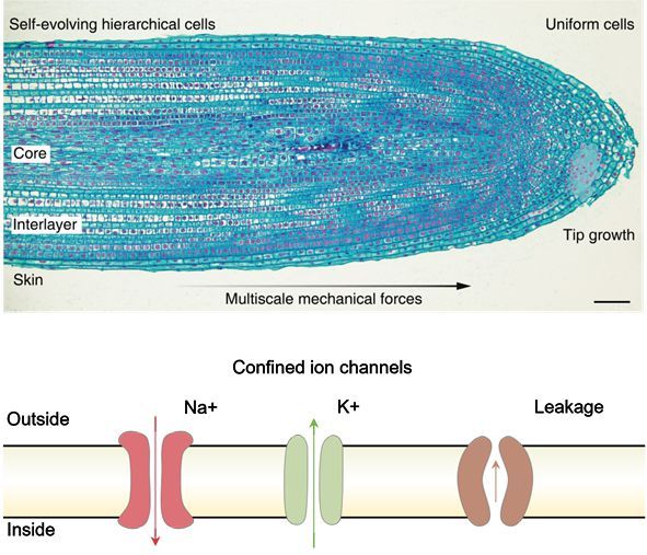生物体中普遍存在着界面融合的层级组织,比如树木的年轮、苹果的果肉和果皮、动物的皮肤组织等。尽管这些组织结构具有不同密度、模量或组分,但它们之间的界面是融合在一起的。这种界面融合的组织不仅可以确保多尺度结构之间高效的物质交换、能量传递与信息交互,还可以平衡组织间的应力分布,以保持整体和局部力学性能之间的均衡。除了基因对层级结构进行的初始编码外,由基本模块原位产生的力和相互作用也对这种界面融合层级结构的进化与形成起到至关重要作用。在生命体演化过程中,层级结构内部还会自发产生限域传输通道用于离子或水的超快选择性输送。这种限域传输通道对于离子或水的离散性具有极高敏感性,展现出独特传输特性。然而,在人工材料的制造过程中,实现界面自发融合以及限域通道原位形成仍然是一个巨大挑战。