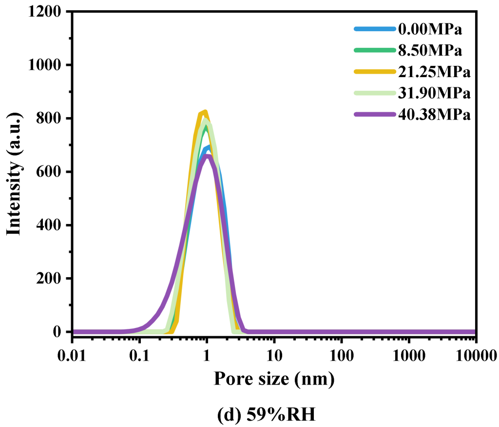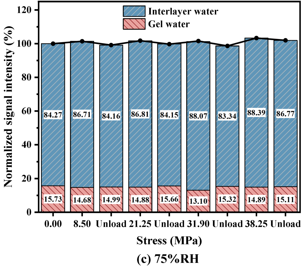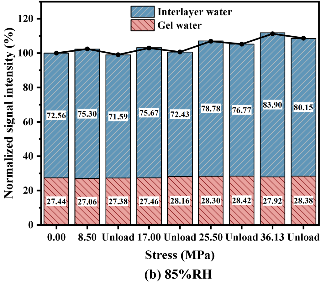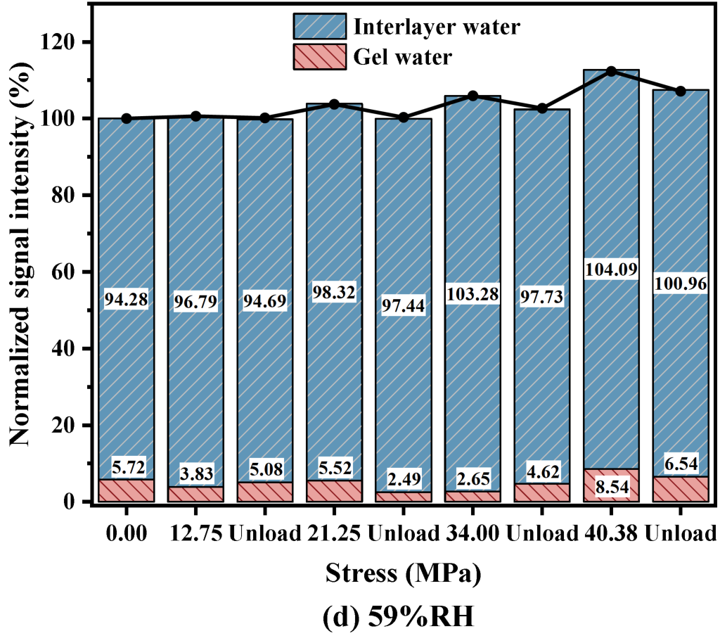 对于100% RH和85% RH试样,加载状态下T2谱中初始横向弛豫时间T2,min随着应力水平的增加逐渐减小。然而,这种变化趋势随着湿度的降低逐渐不明显。这可能是由于HCP微观结构在不同湿度下的变化引起的。当在湿度大于80% RH的环境下干燥时,C-S-H微观结构的变化并不显著。相反的,当硬化水泥浆体在低于80% RH的环境中干燥时,C-S-H层间距逐渐减小,导致荷载作用下层间距的变化变得困难。