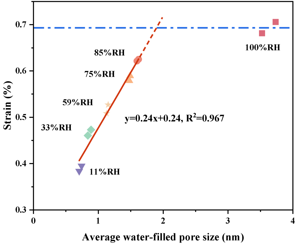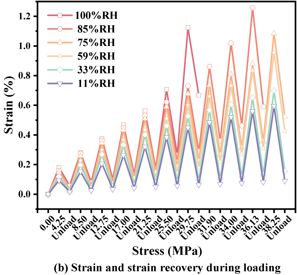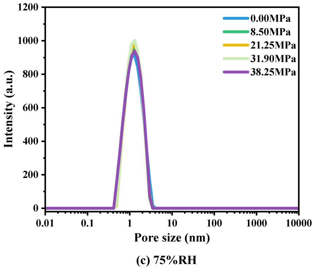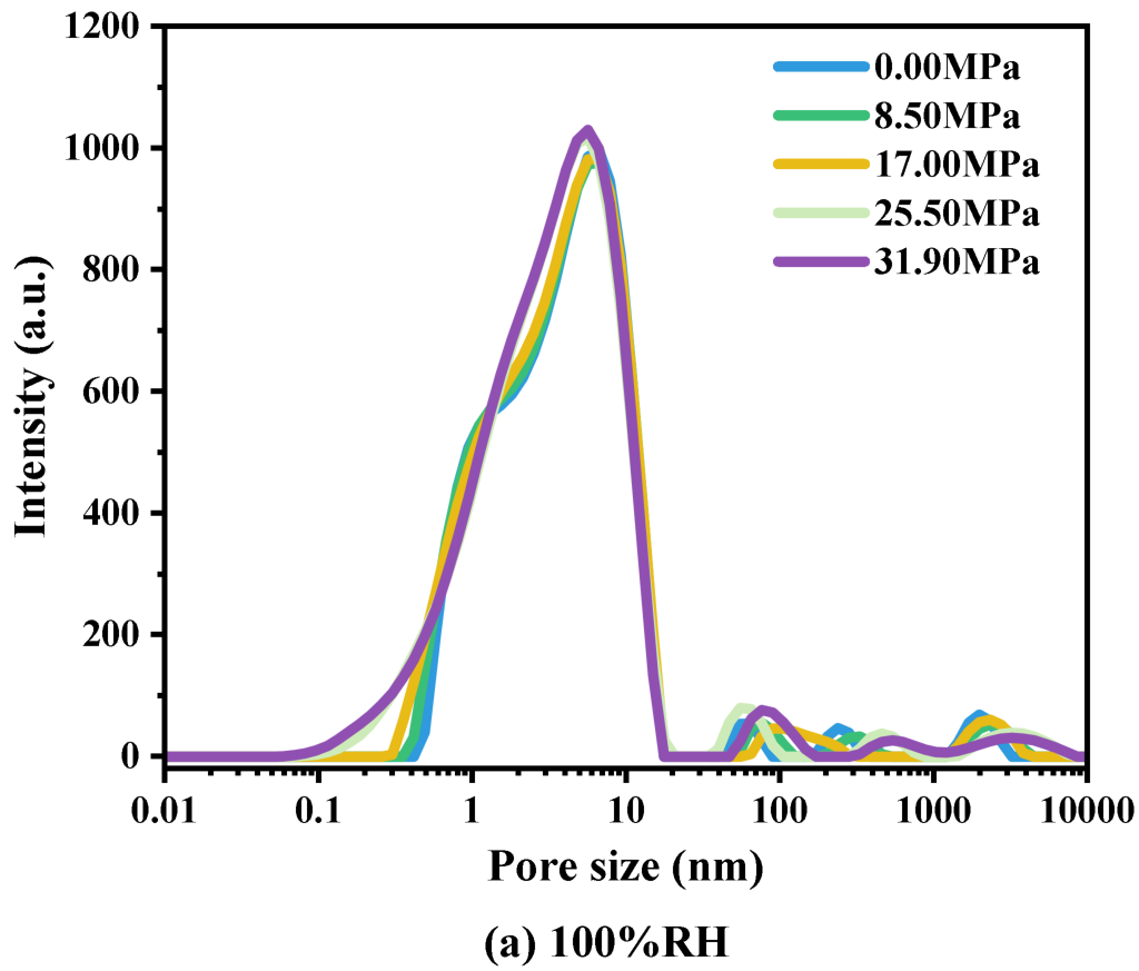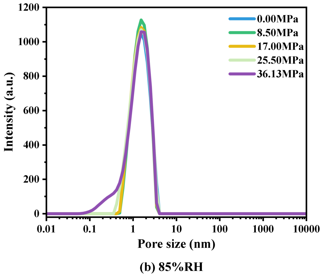 对于100% RH和85% RH试样,加载状态下T2谱中初始横向弛豫时间T2,min随着应力水平的增加逐渐减小。然而,这种变化趋势随着湿度的降低逐渐不明显。这可能是由于HCP微观结构在不同湿度下的变化引起的。当在湿度大于80% RH的环境下干燥时,C-S-H微观结构的变化并不显著。相反的,当硬化水泥浆体在低于80% RH的环境中干燥时,C-S-H层间距逐渐减小,导致荷载作用下层间距的变化变得困难。