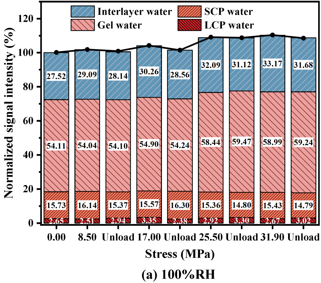 混凝土结构在服役过程中常常受到力与环境因素的显著影响,轴向压力与环境湿度是最常见的两个因素。不同含水量硬化水泥浆体(HCP)在轴向压力作用下的水迁移行为仍知之甚少。本研究引入了一种新型轴向压力控制氢核磁共振(1H NMR)系统,对不同含水量HCP在不同应力水平加载过程中的应变变化和水分布进行了原位监测。结果表明,含水量的降低会减小C-S-H层间距,从而增加C-S-H凝胶的致密化程度,提高水泥基材料的力学性能。C-S-H层滑移的临界点为平均层间距等于1.89 nm。在轴向压荷载作用下,C-S-H凝胶被压缩,导致部分凝胶孔隙重排为层间孔。因此,层间水含量增加,凝胶水含量减少。随着应力水平的增加,层间含水量逐渐增加。当应力水平等于或超过临界应力时达到最大值,此时水分迁移行为从完全可逆转变为部分可逆。这些发现为HCP在机械荷载与水分迁移的耦合作用提供了宝贵的见解,对于预测混凝土结构在各种环境条件下的长期性能和耐久性至关重要。