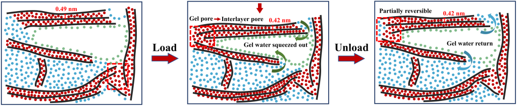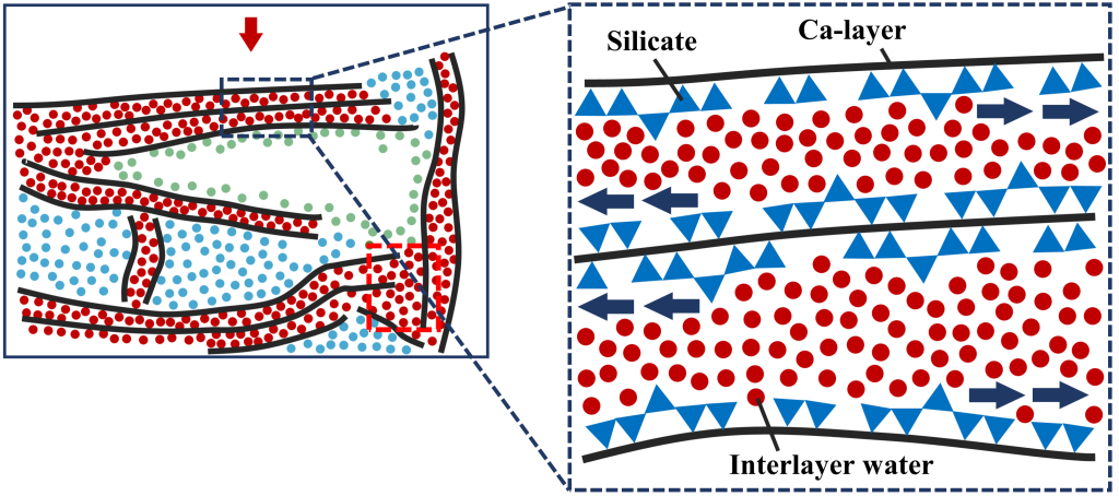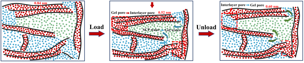 (3)压荷载作用导致C-S-H层间距减小,部分凝胶孔向层间孔转变,同时,层间孔孔径减小。卸载时,受压的层间孔被释放,C-S-H层间距恢复,层间水重新转变为凝胶水。这证明了微观结构变化与水分迁移的密切联系。