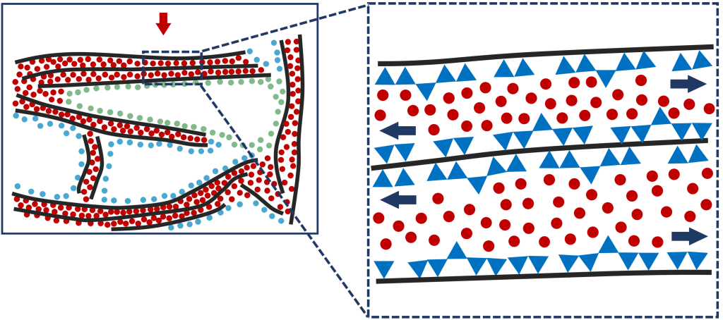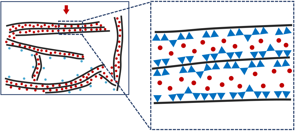 完全饱水HCP的初始微观结构如图9(a)左图所示。荷载作用下凝胶水向层间水迁移,伴随着原本的层间孔被挤压导致更小的层间孔出现,这导致了峰面积增加。同时,部分小毛细孔水向凝胶孔迁移。凝胶水和小毛细孔水的迁移将在卸载状态下恢复,如图9(a)所示。图9(b)展示了部分饱水HCP在荷载作用下的水分迁移过程,可分为两部分:(1)压应力导致C-S-H层间距减小,凝胶孔发生重排,转变为层间孔,同时,更小孔径的被水填充的层间孔产生。值得注意的是,在原位加载的过程中,部分饱和试样仅85% RH试样明显的观察到了微观结构的变化。当干燥程度增加(经历长期干燥或低湿度干燥)时,硅酸盐链的聚合度将增加,导致C-S-H颗粒更硬、更密实(即化学老化),并使C-S-H层间距进一步减小。两者的联合作用将导致微观结构变得难以改变。(2)压应力作用下,凝胶孔中的水被“挤出”,这部分水会沿着相邻的、更大孔中孔壁的水膜迁移。当施加外界压力时,孔隙被压缩,如图10所示。此时,孔径小于开尔文半径的孔隙是饱和的,孔隙中的水将被挤压至更大的孔中。