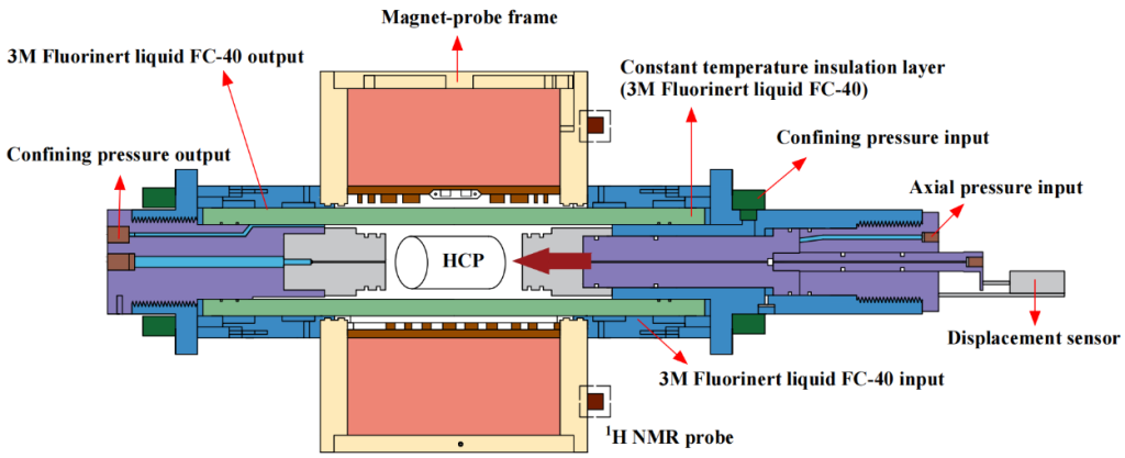 HCP内部水分分布的实时变化情况,揭示这一过程将有助于理解HCP体积变形机制。然而,过去关于水分迁移的研究受传统方法限制,无法实时监测水泥基材料在压荷载作用下的水分迁移过程。1H NMR技术可是一种利用水分子中质子的弛豫特性来测量 CBM 中水含量和分布的新方法。该技术能够对同一样品进行连续、无损的检测,从而准确测试CBM在荷载作用下的水分迁移和重分布过程,是定量研究水分迁移的有力工具。在本研究中,采用1H NMR技术研究了不同相对湿度(RH)环境下 HCP 的水分平衡过程,并评估了达到平衡后的力学性能。此外,还设计了一套具有轴压控制功能的1H NMR系统,用于在不同应力水平下原位监测 HCP 加载过程中的应变和水分分布变化。明确了不同类型孔隙水的水分迁移机制及其对 HCP 力学性能的影响,为CBM的变形机制提供了理论依据。