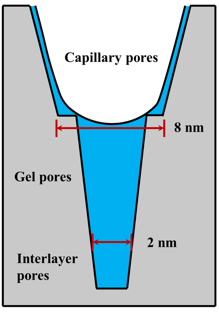 水作为水泥基材料(CBM)的重要组成部分,其在内部孔隙中的分布和迁移将对CBM的性能产生重要影响。根据硬化水泥浆体(HCP)内部孔隙类型,水泥基材料中的水可分为C-S-H层间水、凝胶水、小毛细孔水和大毛细孔水,如表1所示。C-S-H层间水和凝胶水共同存在于纳米尺度的C-S-H凝胶中,是决定C-S-H凝胶微观结构的重要因素。干燥过程中凝胶水和层间水的失去会导致C-S-H层间距减小,凝胶孔向层间孔转变。当干燥状态下的HCP再湿润时,层间孔将重新恢复为凝胶孔。此外,C-S-H层间距影响HCP的徐变性能,C-S-H